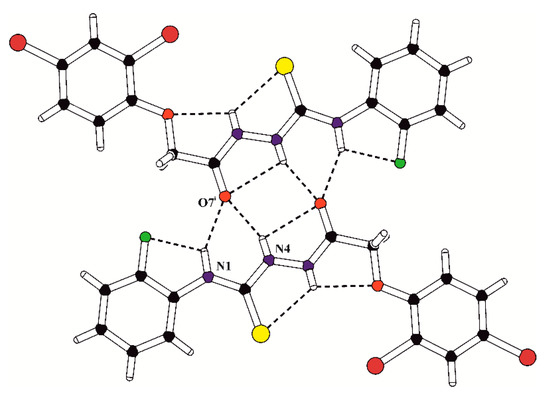 In the crystal structures of PK1, PK2 and PK7, the inversion-related molecules are linked into molecular dimers via the pair of bifurcated intermolecular hydrogen bonds N4–H4…O7 and N1–H1…O7 (Table 2). The structural motif formed by intra- and intermolecular hydrogen-bound molecules in the crystal of PK1 is presented in Figure 2. Moreover, the overlapping of the pairs of parallel benzene rings belonging to inversion-related molecules in PK1 is observed with the π…π distances of 3.652(2) and 3.506(2) Å and the angle between the stacked rings of 8.3(3)°.