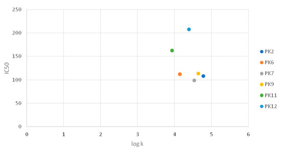 Taking into account the importance of lipophilicity for biological activity, analysis of the dependence of the lipophilicity logk coefficient on the IC50 values obtained for the tested compounds was performed based on the results of the MTT test after 24 h treatment of G-361 melanoma. The analysis was performed for compounds for which specific IC50 values have been determined. However, no significant correlation was found between the biological activity and lipophilicity of the compounds tested (Figure 3).