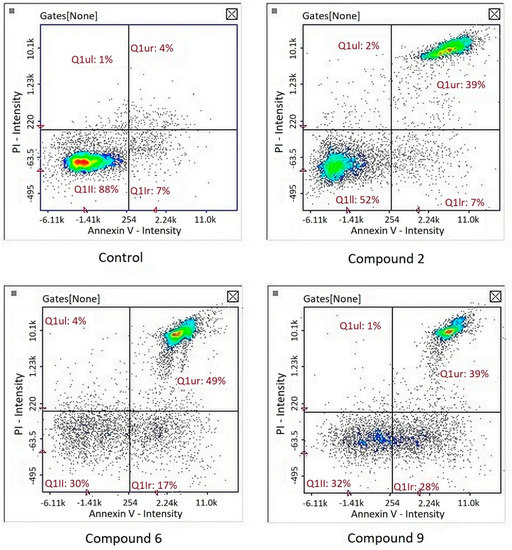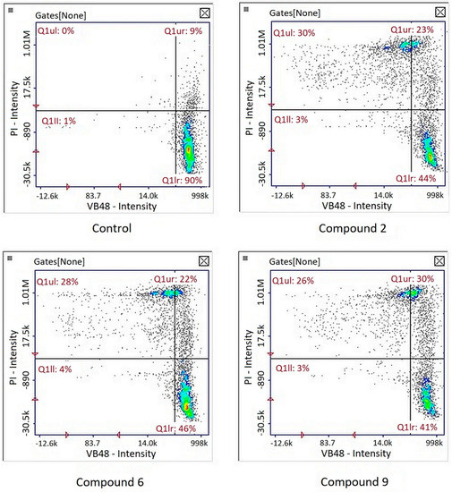 Image cytometry analysis of the cells stained with propidium iodide and Annexin V-FITC demonstrated that in the cultures treated with tested compound, the majority of the population were late apoptotic cells (Figure 5).
