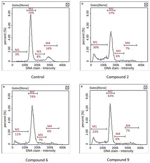 Cell cycle analysis showed that the compounds had no significant effect on cell cycle inhibition. A subG1 phase, corresponding to the population of apoptotic cells, was observed after treatment of the three compounds (Figure 6). Interestingly, in the studies on the gastric cancer cell line MKN74, our team showed that compound PK9 inhibited the cell cycle in S and G2 phases [9]. This was consistent with the observation that the compound had the ability to intercalate into DNA. In the case of melanoma cells, the mechanism of action of this compound seems to be different—no cell cycle arrest was observed; only a cytotoxic effect.