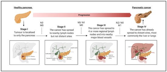 Schematic of Pancreatic Ductal Adenocarcinoma (PDAC) Progression from Early Stages I–II to Advanced Stages III and IV, Including Classification of Regional Lymph Node Spread (N) and Metastasis (M) [11]. N0—the cancer has not spread to nearby lymph nodes; N1—the cancer has spread to <3 regional lymph nodes; N2—the cancer has spread to ≥4 regional lymph nodes; NX—regional lymph nodes cannot be assessed; M0—no metastasis to distant organs or lymph nodes; M1—metastasis to distant organs or distant lymph nodes. Adapted from “Pancreatic Cancer Staging”, by BioRender.com. Retrieved from https://app.biorender.com/biorender-templates (accessed on 13 November 2021).