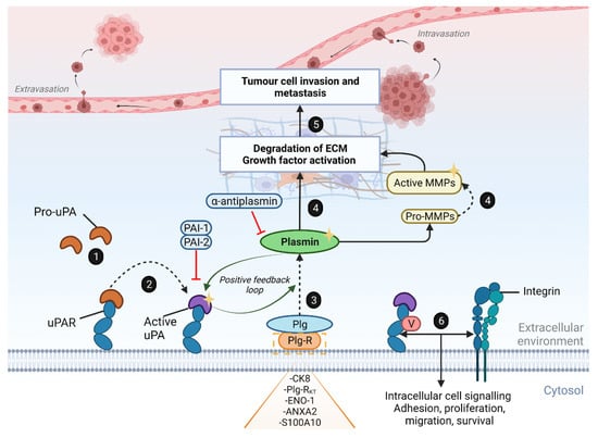 Schematic of the Urokinase Plasminogen Activator (uPA) System. Pro-uPA binds to the uPA cell surface receptor (uPAR) (1) and activates pro-uPA into active uPA (2). Plasminogen (Plg) binds to its receptor (Plg-R; which include, but are not limited to, the well-characterised plasminogen receptors cytokeratin 8 (CK8), plasminogen receptor KT (Plg-RKT), alpha-enolase (ENO1) and annexin 2 (ANXA2) or S100A10), and is cleaved by uPA to elicit the active serine protease plasmin (3). Co-localised plasmin, in turn, activates a positive feedback loop generating more uPA and plasmin. The proteolytic activities of uPA and plasmin are inhibited by the serpins plasminogen activator inhibitor-1 (PAI-1; also known as SerpinE1), and PAI-2 (also known as SerpinB2) and α2-antiplasmin. Plasmin mediates its proteolytic effects directly on extracellular matrix (ECM) components and through the activation of multiple downstream ECM-associated proteins, including latent growth factors and matrix metalloproteinases (MMP’s), to degrade the ECM (4). The degraded matrix provides a path for the migration of cancerous cells to surrounding tissue, facilitating cell migration, invasion, angiogenesis and metastasis (5). uPAR binds to vitronectin (V) and interacts with other co-receptors, such as integrins, to activate intracellular signalling that promotes tumour cell proliferation, adhesion, migration, invasion, epithelial-mesenchymal-transition (EMT) and survival (6). Created with BioRender.com (accessed on 15 November 2021).