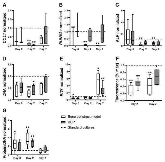 Osteogenic differentiation, proliferation, metabolic activity, and total protein of hASCs in the bone construct model compared to hASCs on BCP alone, both normalized to standard cultures. (A–C): Differentiation-associated parameters. (A) COL1 expression, (B) RUNX2 expression, and (C) Alkaline phosphatase expression. (D–E): Proliferation-associated parameters. (D) DNA content and (E) KI67 expression. (F) AlamarBlue fluorescence (% of max), indicating metabolic activity (G). Total protein. Bone construct model (BCP, cytokines, hypoxia), BCP (BCP, no cytokines, normoxia), standard cultures (plastic, no cytokines, normoxia; dashed line), * p < 0.05, ** p < 0.01 (n = 3–6).