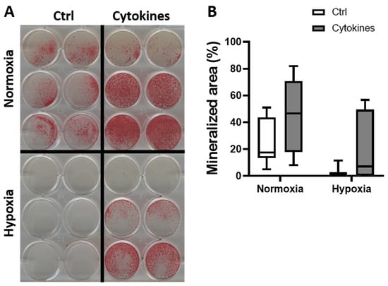 Matrix mineralization was analyzed in cells cultured on plastic without or with cytokines under hypoxia or normoxia for 14 days by using 2% Alizarin Red (Sigma) in water at pH 4.3, as described earlier []. Briefly, hASCs were fixed with 4% formaldehyde for 15 min and rinsed with deionized water before adding 350 µL of the Alizarin Red solution per well. After incubation at room temperature for 30 min, the cells were washed with deionized water. Cells that differentiated into osteoblasts deposited mineralized matrix and produced bright red nodules. Quantification of the mineralized matrix was performed using ImageJ software (National Institutes of Health, Bethesda, MD, USA) as described previously [].