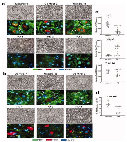 - Wu, G.; Lu, Z.-H.; Kulkarni, N.; Ledeen, R.W. Deficiency of ganglioside GM1 correlates with Parkinson’s disease in mice and humans. J. Neurosci. Res. 2012, 90, 1997–2008. [Google Scholar] [CrossRef] [PubMed]
