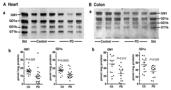 Gangliosides in heart and colon from PD patients and age-matched controls. (A): Heart (n = 18 in each group). (B): Colon (n = 14 in each group). In (A,B), subpanel (a) is HPTLC, and subpanel (b) is densitometry quantification showing the statistical difference between PD and controls, determined by Mann–Whitney rank sum U test (images used are adapted from [] with permission granted by Glycoconjugate J., Copyright 2021 Springer).