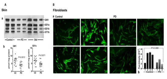 Gangliosides in skin and fibroblasts from PD patients and age-matched controls. (A): Skin (n = 16 in each group). Subpanel (a) is HPTLC, and subpanel (b) is densitometry quantification showing significant difference between PD and controls, calculated by Mann–Whitney rank sum U test. (B): (a) GM1-fluorescent images of cultured fibroblast cells from four non-PD controls and three age-matched PD patients were immunostained for GM1; (b) fluorescence intensity of GM1 staining in fibroblast cells, showing a marginal difference in GM1 by Student’s t-test (image used are adapted from [] with permission granted by Glycoconjugate J., Copyright 2021 Springer).