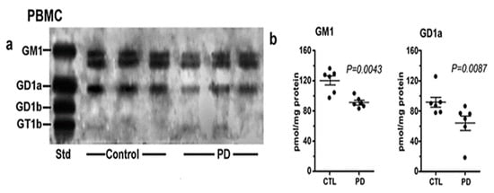 Of considerable interest was our results with PBMC (Figure 5). These white blood cells showed a similar deficiency of both GM1 and GD1a as for PD neurons, despite their lack of direct neuronal involvement. We recently carried out a more detailed study of PBMC in which we found more severe GM1 deficiency in PD patients with glucocerebrosidase malfunction than in PD patients with more ordinary sporadic PD []. We accordingly proposed GM1 deficiency in PBMC as a method for early diagnosis of those two forms of PD.
