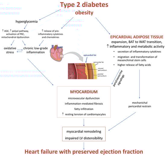 Since the report of the Framingham Heart study, type 2 diabetes (T2DM) has been known to increase the incidence of HF up to more than double with respect to non-affected individuals, with the growing awareness that this complication may develop independently of coronary artery disease (CAD) and associated risk factors [,,,]. A higher risk of hospitalization for HF among T2DM patients was reported in a large cohort study, even with CV risk factors within target ranges []. Otherwise, in a prospective study in patients with type 1 diabetes (T1DM) followed over 7 years, HF occurred only when diabetes coexisted with hypertension and CAD, the two main CV disorders affecting myocardial function []. Diabetes markedly increases the development, morbidity and mortality of HF with preserved ejection fraction (HFpEF), showing a particularly close link with this clinical entity [,]. HFpEF is a complex and heterogeneous syndrome that, despite its growing prevalence and incidence relative to HF with reduced ejection fraction (HFrEF), even retains important knowledge gaps and therapeutic challenges [,]. It is likely that a better understanding of its pathobiology may make it possible to identify effective treatment modalities and thereby ameliorate its prognosis. In recent years, the excess of epicardial adipose tissue (EAT) ended up in the spotlight as a main actor in CV disease and as a detrimental factor promoting inflammation, microvasculopathy, fibrosis, and stiffness of myocardium, all findings corresponding to the hallmarks of HFpEF []. On the other hand, diabetic patients often exhibit an abnormally expanded EAT, usually in association with obesity and metabolic syndrome in both T2DM and T1DM [,,,].