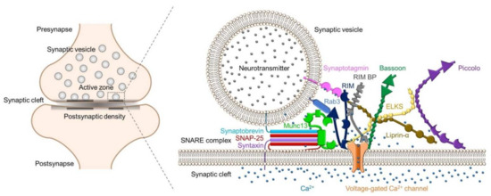 - Sudhof, T.C. The presynaptic active zone. Neuron 2012, 75, 11–25. [Google Scholar] [CrossRef] [Green Version]