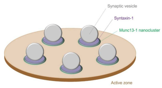 Interestingly, the number of Munc13-1 nanoclusters matches the number of release sites in cultured rat hippocampal glutamatergic synapses [7]. Furthermore, Munc13-1 clusters are formed by supramolecular self-assembly, and the SNARE protein syntaxin 1, which is essential for synaptic vesicle exocytosis, is recruited to each Munc13-1 cluster [7] (Figure 2). Intriguingly, the number of functionally analyzed release sites for each synapse ranged from 1 to 18, with an average of 4.9 [7]. Most CNS synapses have a single active zone detected by electron microscopy; however, multiple Munc13-1 clusters may serve as a mechanism for the release of multiple synaptic vesicles in response to a single action potential.