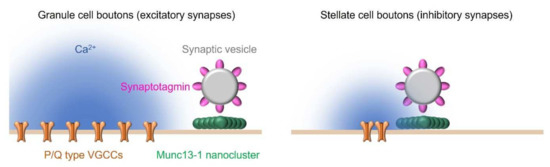 Differences in the distances between synaptic proteins allow synapse-specific regulation of the release probability at cerebellar synapses. Munc13-1 was located approximately 50 nanometers from P/Q-type VGCCs in granule cell boutons. In contrast, Munc13-1 was tightly coupled to a cluster of P/Q-type VGCCs in stellate cell boutons (approximately 10 nanometers). The distance between Munc13-1 and P/Q-type VGCCs at these synapses results in a lower probability of synaptic vesicle release at granule cell synapses and a higher release probability at stellate cell synapses. This figure is adopted with modifications from Liu et al., Neuron 2019, 104, 627 [98] (with permission from Elsevier, Inc., license number: 5191011347259).
