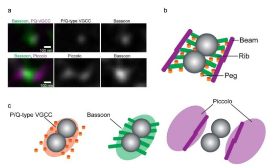 Active zone proteins and structure of mouse NMJs. (a) Dual-color STED micrographs show an overlap of Bassoon (green) and P/Q-type VGCCs (magenta) and the side-by-side distribution pattern of Bassoon (green) and Piccolo (magenta). (b) The structural model of a mouse NMJ active zone was elucidated using electron microscopy (EM) tomography [100]. (c) A theoretical overlay of the active zone protein distribution pattern on the active zone structure model. The “pegs” in the EM tomography model are considered transmembrane channel proteins, which may include P/Q-type VGCCs. The side-by-side distribution pattern of Piccolo and Bassoon resembles the distribution pattern of structures named the “beams” and the “ribs” in the EM tomography model. These figures were adopted from Nishimune et al., Sci. Rep. 2016, 6, 27935 [5], and the EM tomography model was adopted with modification from Nagwaney et al., J. Comp. Neurol., 2009, 513, 457 [100] (with permission from John Wiley & Sons, Inc., license number: 5191011487547).