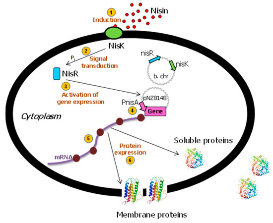The Nisin-Controlled Gene Expression (NICE) system in L. lactis. After the detection of nisin by the membrane-located sensor protein (NisK) ①, this histidine protein kinase autophosphorylates and transfers its phosphate group to activate the cytoplasmic response regulator NisR ②. Activated NisR ③ subsequently induces transcription controlled by the PnisA promoter ④. After transduction, ⑤ and depending on the presence or absence of the corresponding targeting signals, the protein is either expressed into the cytoplasm or the membrane, or secreted into the external medium ⑥. B. chr: bacterial chromosome. Adapted from [12,25].