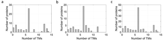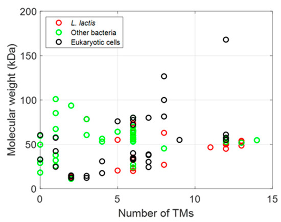 The membrane proteins listed in Table 2, Table 3 and Table 4 can be plotted according to the number of their TM helices and their molecular sizes. As shown in Figure 3, a large number of MPs have sizes below 100 kDa, with many MPs having either 6 or 12 TM helices, whether they are prokaryotic, from L. lactis or other bacteria, or are of eukaryotic origin (Figure 3 and Figure 4), thus highlighting the two large families of proteins expressed (ABC and mitochondrial transporters).