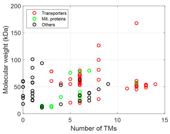 Relationship between function (transporters in red, mitochondrial proteins in green, and other functions in black), size, and topology of MPs expressed in L. lactis.