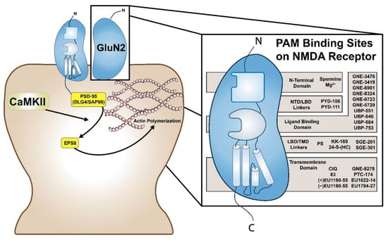 - Hackos, D.H.; Hanson, J.E. Diverse Modes of NMDA Receptor Positive Allosteric Modulation: Mechanisms and Consequences. Neuropharmacology 2017, 112, 34–45. [Google Scholar] [CrossRef]