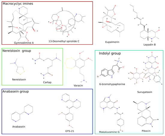 Diversity of low-molecular weight nicotinic acetylcholine receptor (nAChR) ligands of marine origin and some of their synthetic analogs. Nitrogen atoms are indicated in blue, oxygen in red, sulfur atoms in yellow and bromine in brown.