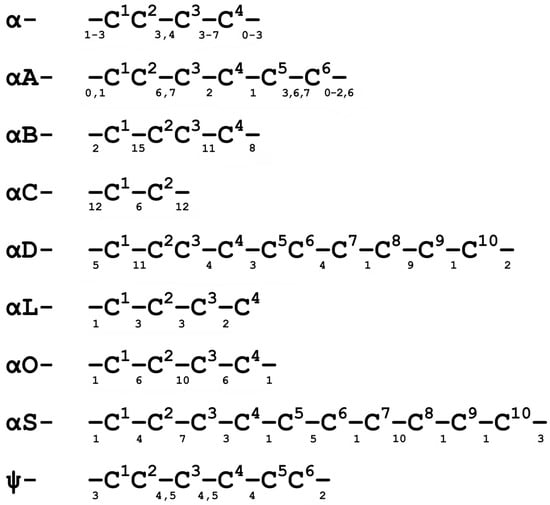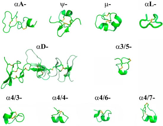 Isolated from Conus venoms or revealed by genetic methods and then synthesized, several dozen α-conotoxins are additionally subdivided into groups according to the number of amino acid residues in their first and second loops (between Cys2-Cys3 and Cys3-Cys4, respectively). Five such groups are traditionally known (3/4, 3/5, 4/4, 4/6, 4/7), and spatial structures of a large number of their representatives were established by NMR or X-ray analysis (Figure 3). The first representative of the new 5/5-group, α-conotoxin AusIA, was isolated from the venom of C. australis, but its globular and ribbon forms showed low affinity (IC50 ≥ 10 μM) only to α7 nAChR []. In addition, a new conotoxin Pl168 with a cysteine pattern characteristic of α-conotoxins was discovered recently, but with unusual 4/8-spacing, for which, however, no nAChR subtype has been identified as a target [].
