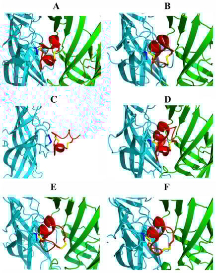 Ribbon representation of the ligand-binding sites in the structures of complexes of some α-conotoxins of different groups with homologues of nAChRs based on the X-ray data. (A) α4/3-conotoxin ImI AChBP from A. californica (PDB 2C9T), (B) α4/4-conotoxin BuIA AChBP from A. californica (PDB 4EZ1), (C) α4/3-conotoxin RgIA extracellular domain of the α9 subunit of human nAChR (PDB 6HY7), (D) α4/7-conotoxin LvIA AChBP from A. californica (PDB 5XGL), (E,F) globular and ribbon isoforms of α5/5-conotoxin AusIA AChBP from L. stagnalis (PDB 7N0Y and 7N0W). In all cases (except for the monomeric domain), only two adjacent protomers of AChBP pentamer are represented, the principal side being colored cyan, and the complementary side colored green. All conotoxins are colored red with yellow disulfides. The vicinal disulfide in C-loop of the principal side is colored blue.