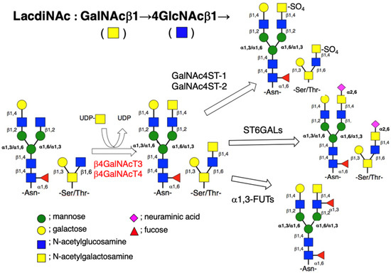 2. Biosynthesis of LacdiNAc Group and Its Modification in Mammalian Cells