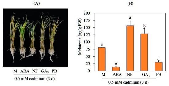 Melatonin content in response to plant hormones. (A) Phenotypes of 7-day-old rice seedlings after hormone and cadmium treatments. (B) Melatonin content. Seven-day-old rice seedlings rhizospherically treated with various hormones independently for 24 h, then treated with 0.5 mM cadmium for 3 days. Different letters indicate significant differences (p < 0.05; analysis of variance (ANOVA), followed by Tukey’s honest significant difference (HSD) post hoc tests). M, water containing 0.1% ethanol; ABA, 1 μM abscisic acid; NF, 10 μM norflurazon; GA3, 10 μM gibberellic acid 3; PB, 10 μM paclobutrazol.