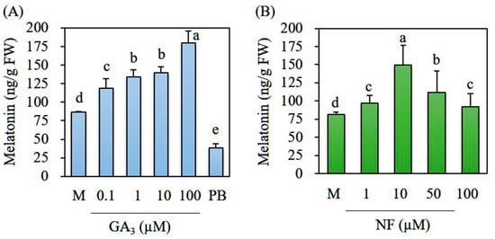 Dose-dependent melatonin levels in response to (A) GA3 and (B) norflurazon. Various concentrations of GA3 or NF were used to rhizospherically treat to 7-day-old rice seedlings for 24 h, followed by treatment with 0.5 mM cadmium for 3 days. Melatonin content was quantified using high-performance liquid chromatography (HPLC). Different letters denote significant differences (p < 0.05; ANOVA, followed by Tukey’s HSD post hoc tests). M, water containing 0.1% ethanol; GA3, gibberellic acid 3; PB, pachlobutrazol; NF, norflurazon.