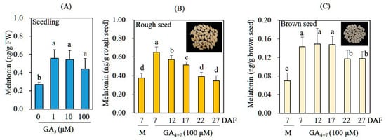 Melatonin levels in (A) rice seedlings, (B) rough seeds, and (C) brown seeds after treatment with GA in the absence of cadmium treatment. Seven-day-old rice seedlings were treated with various concentrations of GA3 for 24 h; leaves or seeds were subjected to HPLC quantification of melatonin. In addition, immature rice seeds were treated at various time intervals with 100 µM of commercially available GA4+7 (Daeyu Co., Ltd.) three times every other day in the field. After 60 days after flowering (DAF), rice seeds were harvested for melatonin quantification. Different letters denote significant differences (p < 0.05; ANOVA, followed by Tukey’s HSD post hoc tests). M, water containing 0.1% ethanol; GA3, gibberellic acid 3.