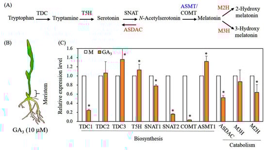 Seven-day-old rice seedlings were challenged with 10 μM GA3 for 12 h; their meristematic tissues were separated and harvested for total RNA extraction (Figure 4B). To determine whether GA3 treatment altered the expression of genes responsible for melatonin synthesis and degradation, we performed qPCR gene expression analysis using ACT1 as a reference gene (Figure 4A). Expression levels of melatonin biosynthetic genes tryptophan decarboxylase 3 (TDC3), tryptamine 5-hydroxylase (T5H), and N-acetylserotonin O-methyltransferase 1 (ASMT1) were elevated by GA3 treatment; expression levels of the biosynthetic genes TDC1, SNAT1, SNAT2, and caffeic acid O-methyltransferase (COMT) were downregulated (Figure 4C). SNAT1 and SNAT2 were downregulated in melatonin-treated rice seedlings, suggesting feedback regulation upon melatonin response []. Among catabolic genes, GA3 treatment inhibited the expression of N-acetylserotonin deacetylase (ASDAC) and melatonin 2-hydroxylase (M2H), whereas the expression of melatonin 3-hydroxylase (M3H) was not altered; the suppression of these two catabolic genes presumably facilitated melatonin production under GA3 treatment compared with the mock control. Because GA action occurs in meristem tissues, we applied qPCR analysis to meristematic tissues []. The expression profiles of genes related to melatonin biosynthesis and catabolism in rice upper leaves were not significantly altered in response to GA3 treatment (data not shown).