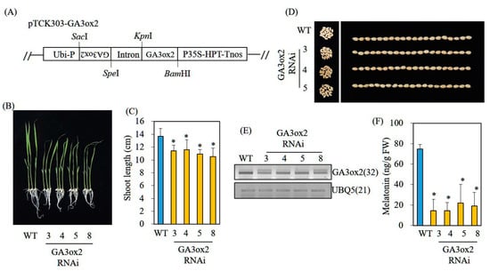 Structure of binary vector pTCK303-GA3ox2 and the generation of GA3ox2-suppressed transgenic rice plants. (A) Schematic diagram of the pTCK303:GA3ox2 binary vector. (B) Seven-day-old rice seedling phenotypes of wild-type (WT) and GA3ox2 RNAi transgenic rice (T2). (C) Shoot length measurement. (D) Seed phenotype. (E) RT-PCR analysis results for WT and T2 lines. (F) Melatonin levels of WT and transgenic lines. Seven-day-old rice seedlings challenged with 0.5 mM cadmium for 3 days, then subjected to melatonin quantification. Asterisks (*) indicate significant differences from the WT (p < 0.05; ANOVA, followed by Tukey’s HSD post hoc tests). Numbers in parentheses indicate numbers of PCR cycles. GenBank accession numbers: Os01g0177400 (GA3ox2) and Os03g13170 (UBQ5). Ubi-P, maize ubiquitin promoter; P35S, 35 S cauliflower mosaic virus 35S promoter; HPT, hygromycin phosphotransferase; Tnos, nopaline synthase terminator.