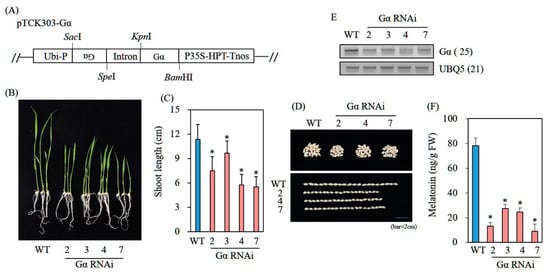 Structure of binary vector pTCK303-Gα and generation of Gα-suppressed transgenic rice plants. (A) Schematic diagram of pTCK303:Gα binary vector. (B) Seven-day-old rice seedling phenotypes of WT and Gα RNAi transgenic rice (T2). (C) Shoot length measurement. (D) Seed phenotype. (E) RT-PCR analysis results for WT and T2 lines. (F) Melatonin levels of WT and T2 lines. Seven-day-old rice seedlings challenged with 0.5 mM cadmium for 3 days and then subjected to melatonin quantification. Asterisks (*) indicate significant differences from WT (p < 0.05; ANOVA, followed by Tukey’s HSD post hoc tests). Numbers in parentheses indicate the numbers of PCR cycles. GenBank accession numbers: D38232 (Gα) and Os03g13170 (UBQ5). Ubi-P, maize ubiquitin promoter; P35S, 35 S cauliflower mosaic virus 35S promoter; HPT, hygromycin phosphotransferase; Tnos, nopaline synthase terminator.
