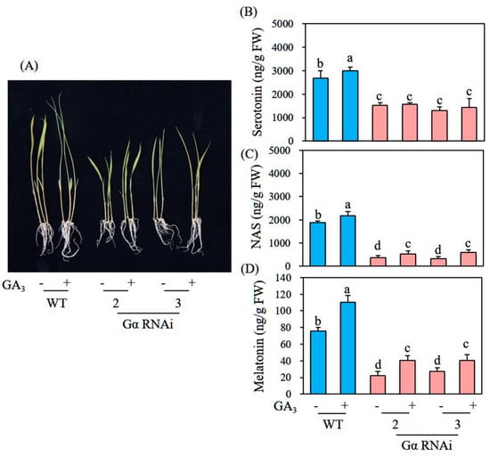 Effect of GA3 in the Gα RNAi lines. (A) Seedling phenotypes in response to GA3 (10 μM) treatment for 24 h, followed by treatment with 0.5 mM cadmium for 3 days. (B) Serotonin levels after GA3 and cadmium treatment. (C) N-Acetylserotonin levels after GA3 and cadmium treatment. (D) Melatonin levels after GA3 and cadmium treatment. Seven-day-old rice seedlings of WT and T2 homozygous Gα RNAi lines were used. Data are means of three replicates. Different letters denote significant differences (p < 0.05; ANOVA, followed by Tukey’s HSD post hoc tests).