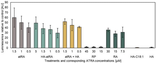 HA-atRA retained its ability to induce gene expression initiated via the pRAREβ2 promoter in a dose-dependent manner (Figure 1). A higher dose of HA-atRA (5 µM atRA equivalents) was needed to achieve the effect elicited by 1 µM atRA. However, even higher doses of retinyl acetate (RA) were needed to achieve the effects of 1 µM HA-atRA. RP induced only negligible luciferase expression compared to the other retinoids. HA-C18:1 and HA served as controls, which, as expected, did not induce luciferase expression; their luminescence values corresponded to the untreated cells.