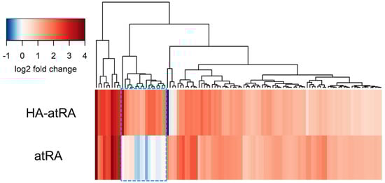 Genes upregulated by HA-atRA and atRA relative to control. Fibroblasts were treated with HA-atRA or atRA. Gene expression was analyzed using microarrays. The dendrogram shows the genes upregulated more than 200% in either or both groups relative to untreated control. Log2 of 1 corresponds to 200% upregulation; log2 of 2 is 400%, etc. Negative values of log2 represent downregulation. Box with blue dashed line highlights the genes significantly upregulated by HA-atRA only. N = 4 for each sample.