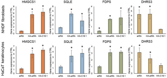 Gene expression of steroid synthesis genes (HMGCS1, SQLE, FDPS) and canonical atRA-induced gene DHRS3. Keratinocytes and fibroblasts were treated with atRA, HA-atRA and HA-C18:1. Gene expression was measured by means of qPCR, and the values are related to untreated controls. The bars represent the mean ± SD of four independent experiments. * p < 0.05, t-test compared to untreated control.