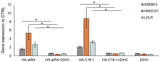 Inhibition of SREBP2 by 25-HC in HaCaT keratinocytes. Gene-expression analysis of the samples treated with HA-atRA or HA-C18:1 combined with 25-hydroxycholesterol (1 µM). The bars represent the mean ± SD of four independent experiments. The decreases in SREBF2, HMGCS1 and LDLR after the addition of 25-HC were significant (* p < 0.05, t-test) compared to respective HA-atRA and HA-C18:1 treatments.