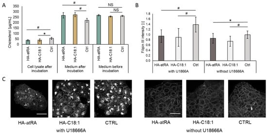 Relative cholesterol content was quantified using filipin III staining via confocal microscopy (Figure 5B,C). The treatments with HA-atRA or HA-C18:1 resulted in significantly lower staining intensity, in concordance with the HPLC results. When cells are preincubated with the U18666A lysosomal cholesterol export inhibitor, the intracellular cholesterol increases [26]. Therefore, the loss of intracellular cholesterol in the U18666A-preincubated cells was even more pronounced after treatment with HA-atRA or HA-C18:1.