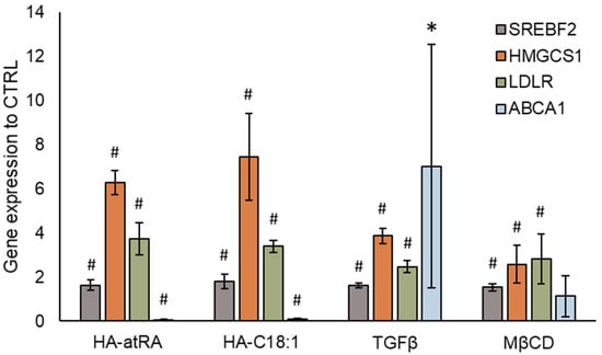 Gene expression of cholesterol transporter ABCA1. Cholesterol synthesis was induced by HA-atRA, HA-C18:1, TGFβ or MβCD. The bars show the mean ± SD of n = 4 experiments relative to the untreated controls. * p < 0.05, # p < 0.01 compared to the untreated control using t-test.
