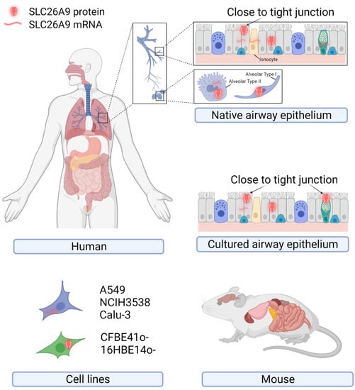 Endogenous expression of SLC26A9 in human tissues, primary and immortalized cell lines of human origin, and mouse tissues. The cartoons show tissues and cells reported to express SLC26A9 at the mRNA and/or protein levels. Details of the putative subcellular localization (intracellular compartments or plasma membrane close to the tight junctions) are shown for the native and cultured airway epithelia. Created with BioRender.com (21 January 2022).