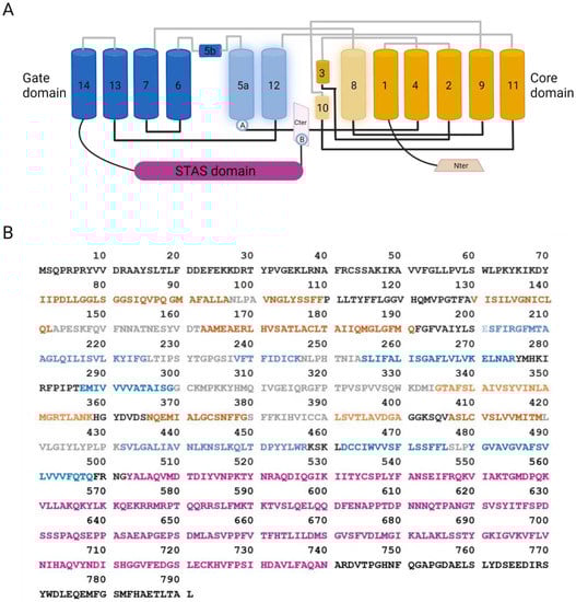 SLC26A9 structure. (A) Cartoon showing the topology of SLC26A9, as determined by Chi and colleagues. The gate domain is colored in blue, the core domain is colored in orange, and their participation in the intracellular pocket is highlighted by increased transparency. Extracellular and intracellular loops are colored in grey and black, respectively. The STAS domain is colored in purple, C-terminal in pink, and N-terminal in light orange. Ⓐ: Location of E201K mutation in TM5, which, together with the C-terminal mutation S781A, provided increased currents measured by single-channel recordings. The same results were obtained by mutating different residues visually represented by Ⓑ: E775A/Q776A/F779G/S781G/M782G/F783G and E775A/Q776A. Those mutations can interfere with the interaction between the C-terminal and the TM5 or TM12 []. Created with BioRender.com (21 January 2022); (B) Amino acid sequence of SLC26A9. Residues are colored as the corresponding domains in (A).