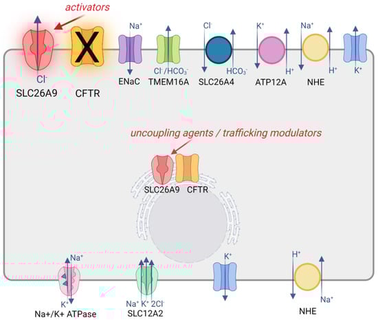SLC26A9 as a potential therapeutic target in CF. The cartoon shows a simplified airway epithelial cell model with some of the various transporters, channels, and exchangers involved in ion secretion mechanisms. Among these, SLC26A9 could be potentially targeted to circumvent the reduced chloride secretion due to the loss of function of CFTR by searching for small molecules acting as activators or potentiators of its ion transport activity. Additional strategies could involve the finding of trafficking modulators being able to increase SCL26A9 expression at the plasma membrane, possibly acting also as uncoupling agents with respect to the interaction with F508del-CFTR. Created with BioRender.com (21 January 2022).