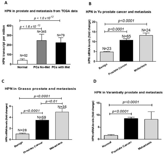 Hepsin mRNA levels were significantly increased in metastatic prostate tumors. (A) TCGA prostate cancer dataset. (B) The data from Yu’s study. (C) The data from Grasso’s study. (D) The data from Varambally’s prostate cancer study.