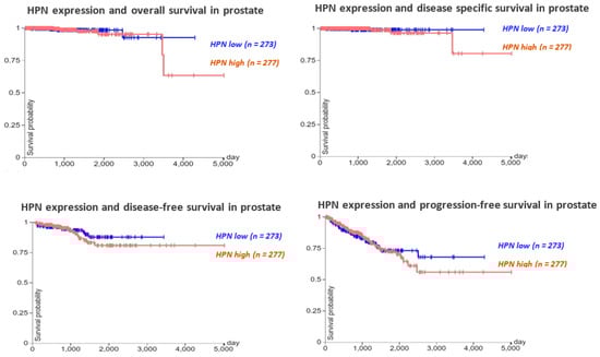 The association between HPN expression levels and overall survival, disease-specific survival, disease-free survival, and progression-free survival in prostate cancer (TCGA data, 550 cases of prostate cancer).