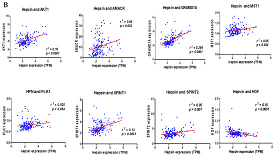 Using protein–protein interaction software, we noticed several known regulating genes and proteins in this network, including AMACR, AKT1, GRAMD1A, HGF, MST1, PLK1, SPINT1, and SPINT2 (Figure 5). Consistent with the hepsin expression levels in prostate cancer, these genes’ expression levels were also significantly increased in cancer tissues in comparison with normal prostate tissues (Figure 6A). Their expression levels were positively correlated with hepsin in prostate cancers according to an analysis of Taylor’s dataset [38] (Figure 6B). As described above, hepsin interacts with AKT1, HGF, MSP/MST1, etc., and the catalytic activities of hepsin are also regulated by serine protease Inhibitor Kunitz type 1 (SPINT1, HAI-1) and serine protease inhibitor Kunitz type 2 (SPINT2, HAI-2). Both proteins are potent specific inhibitors of the HGF activator and are thought to be involved in the regulation of HGF-mediated proteolytic activation. However, HGF expression is reduced in prostate cancer, compared to in normal tissues, and is negatively correlated with hepsin in prostate cancer (Figure 6B). Similar results were also observed in the TCGA prostate cancer dataset (Supplementary Figure S4).