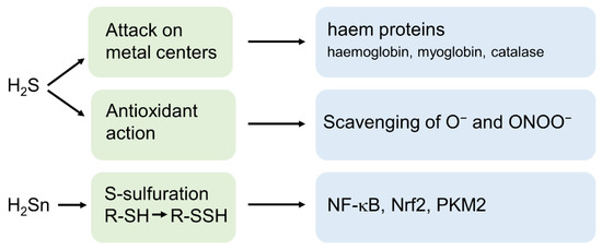 Molecular targets of H2S and polysulfides (H2Sn). H2S affects metalloproteins and acts as a scavenger of superoxide anion (O2−) and peroxynitrite (ONOO−). H2Sn is the most important mediator of S-sulfuration of cysteine thiols. NF-kB, Nuclear factor kappa-light-chain-enhancer of activated B-cells; Nrf2, Nuclear factor erythroid 2-related factor 2; PKM2, pyruvate kinase M2.