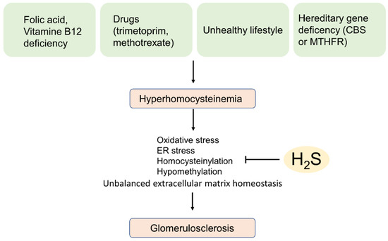 H2S attenuates hyperhomocysteinemia-induced glomerulosclerosis. H2S reduces symptoms hyperhomocysteinemia such as oxidative stress and ER-stress. CBS, cystathionine-β-synthase; ER stress, endoplasmic reticulum stress; MTHFR, methylenetetrahydrofolate reductase.