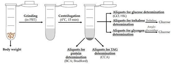 Exemplary protocol for assessment of the body composition of Drosophila melanogaster. After determining their body weight, flies are ground in Dulbecco’s phosphate-buffered saline with Triton X-100 (PBT) by using a tissue homogenizer. Following centrifugation, aliquots of the supernatant are utilized for further measurements. The protein content is determined with a bicinchoninic acid (BCA) or Bradford assay, the TAG content with coupled colorimetric assays (CCAs) and the glucose content with enzymatic methods based on the enzyme glucose oxidase (GO) or hexokinase (HK). For assessment of trehalose and glycogen concentrations, enzymatic treatments with trehalase and amyloglucosidase are conducted, respectively, after which free glucose is determined (modified from []).