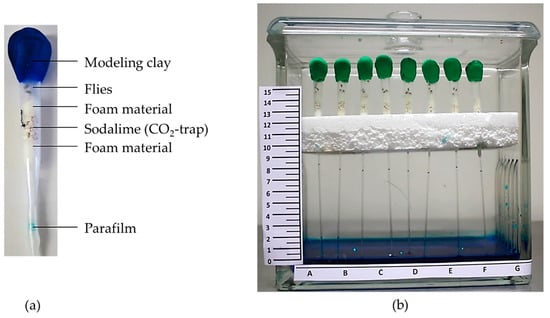 Schematic of the self-assembled respirometer setup. (a) The respirometer is a small metabolic chamber built from a pipette tip, a micropipette, Parafilm, foam and CO2-absorbing soda lime. After brief anesthetization, flies are placed into the respirometer chamber, which is subsequently closed with a plug of food and covered with plasticine. (b) After an adaptation period, the respirometers are inserted into a holder in an outer chamber so that the micropipette tips are immersed into a layer of dyed water. The lid of the outer chamber is closed, and a first photograph is taken. The changes in the filling volume of the micropipettes are documented with additional photographs. By using image processing software, the distances of capillary filling are determined. The amount of CO2 produced per fly and hour is calculated via the formula: (micropipette radius × ratio of capillary filling of the micropipette at the start and end point for the sample—negative control) × 1000)/(number of flies × duration of exposure) (modified from []).