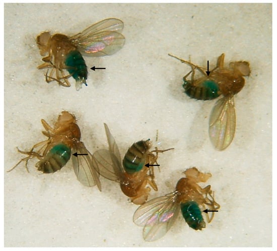 Fertility describes the proportion of living offspring from laid eggs []. Fertility assessment involves monitoring the development of laid eggs and the documentation of the percentages of larvae, pupae and/or adult flies [,,]. The influences of nutritional factors on male and female fecundity and fertility can be determined by different prefeeding and crossbreeding experiments. The effect of nutrition on male fertility, for example, can be determined by prefeeding virgin males with a standard or test medium, subsequently mating them with virgin females prefed with a standard medium and counting the viable offspring [].