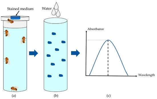 Excreta quantification (EX-Q). (a) For EX-Q, flies ingest a medium stained with a nonabsorbent dye in the overhead position, and the dye is excreted with the feces. (b) The flies are removed, and the vials with the fecal spots are rinsed with water. (c) The absorption is measured photometrically, and the amount of ingested food is quantified with a standard curve (modified from []).